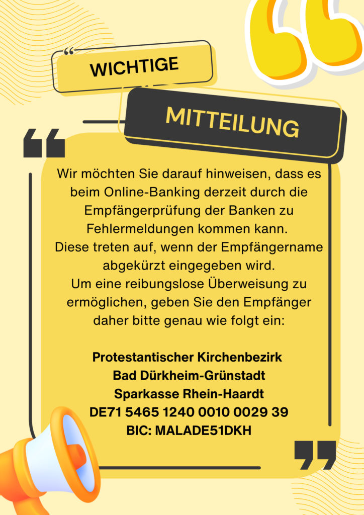 Wir möchten Sie darauf hinweisen, dass es beim Online-Banking derzeit durch die Empfängerprüfung der Banken zu Fehlermeldungen kommen kann.