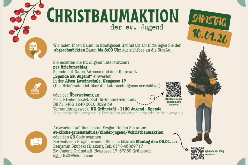 Wir holen Ihren Baum im Stadtgebiet Grünstadt ab. Die Ev. Jugend freut sich über Ihre Spende und Unterstützung.