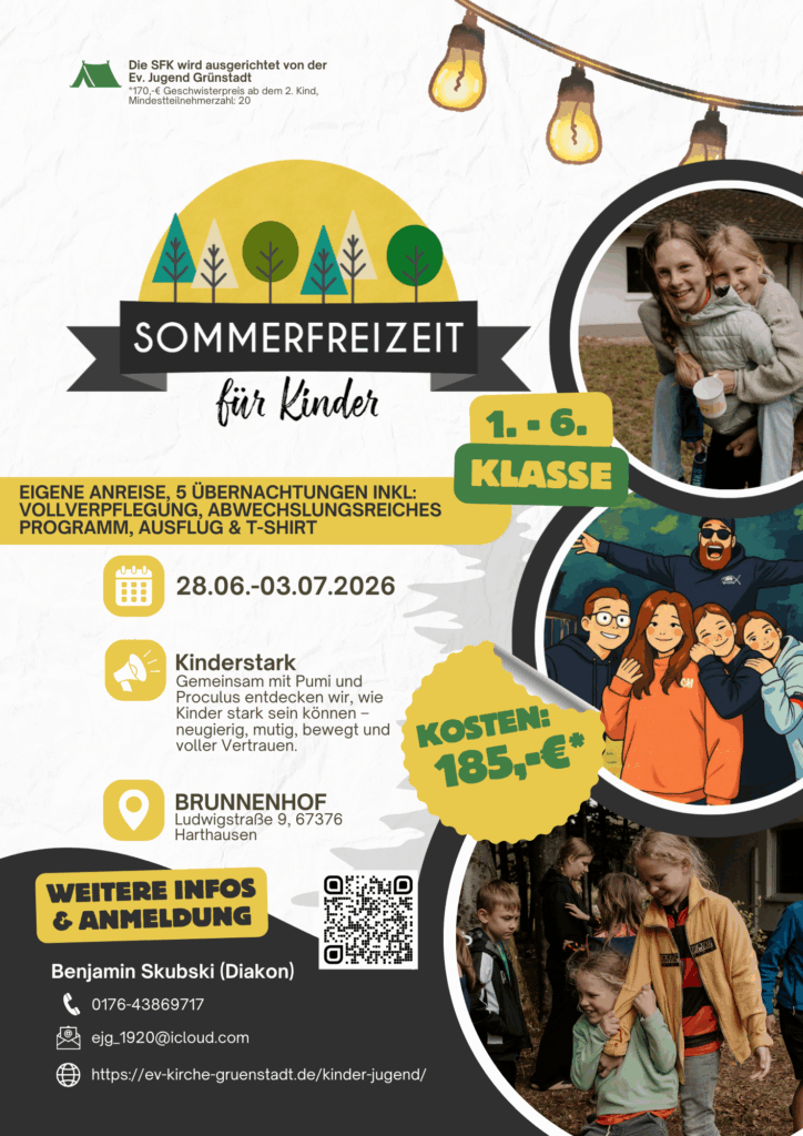 Die Sommerfreizeit für Kinder bietet ein abwechslungsreiches Ferienprogramm voller Spaß und Erlebnisse. Während unserer sechs gemeinsamen Tage singen wir täglich Lieder, tauchen in biblische Geschichten ein und erleben ein buntes Programm mit Spielen, Kreativem und vielem mehr. Für leckeres Essen ist bestens gesorgt, und besondere Aktionen wie ein Ausflug oder ein Lagerfeuer machen die Freizeit zu etwas ganz Besonderem.