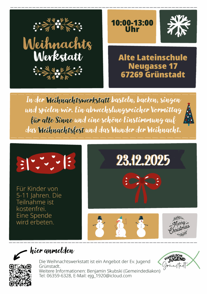 Die Weihnachtswerkstatt ist ein Angebot der Ev. Jugend Grünstadt für Grünstadt und Umgebung. Gemeinsam wollen wir uns auf Weihnachten einstimmen mit Spielen, Backen und Basteln. Für Eltern der ideale Augenblick, letzte Vorbereitungen zu treffen oder noch Geschenke zu besorgen.